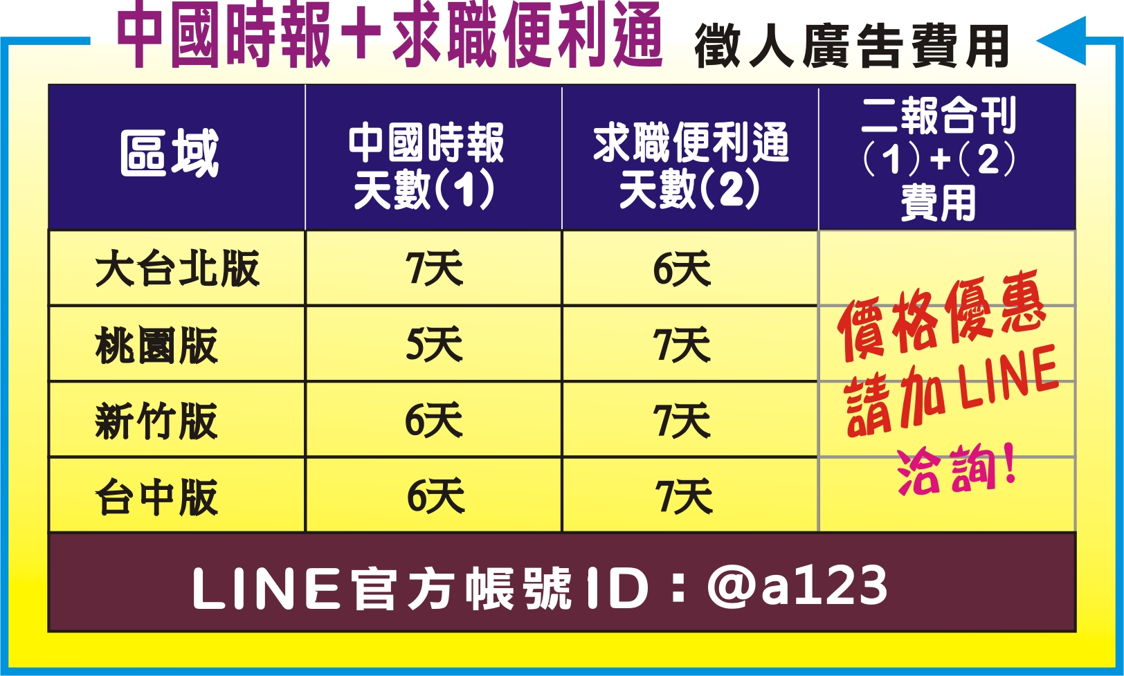 中國時報刊登地區:大臺北、桃園、新竹、臺中,各地區規格、費用、天數均不同,登報徵人刊登費用價格如何算? 歡迎加 Line 官方帳號 @a123 詢問。